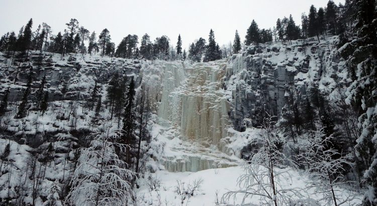 Entlang des Ufers eines gefrorenen Flusses erreichten wir nach etwa einer halben Stunde den beeindruckenden Wasserfall „Ruskea virta“, der auch bei Eiskletterern ein beliebtes Ausflugsziel war.